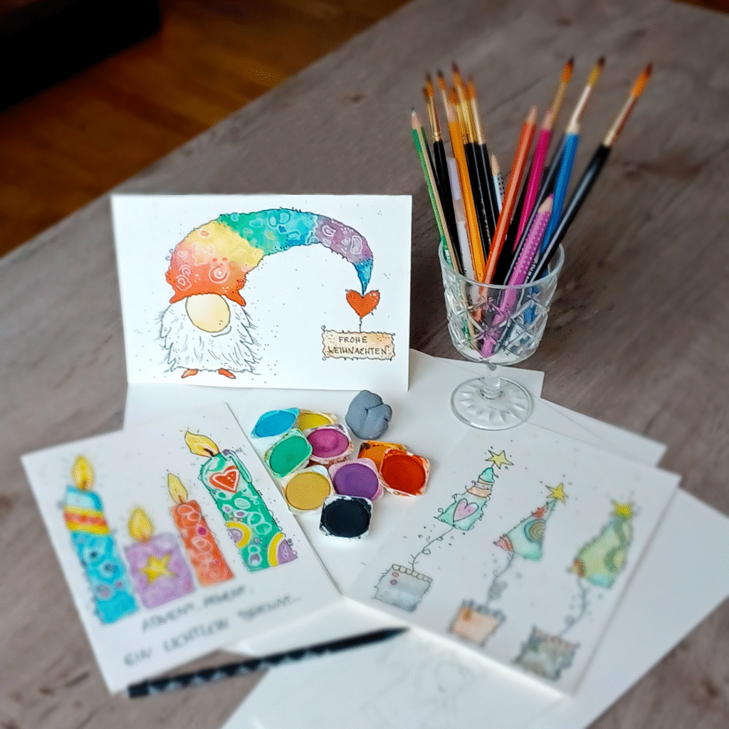 Der Advent steht vor der Tür und wir wollen uns mit Stift und Pinsel daran machen, Weihnachtskarten für unsere Lieben selbst zu gestalten.